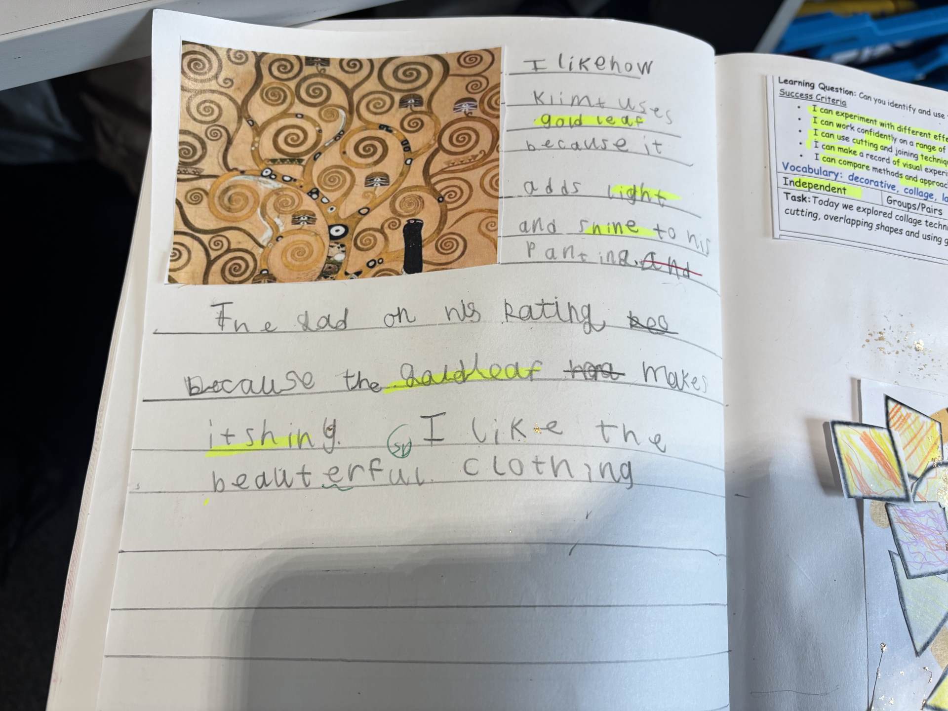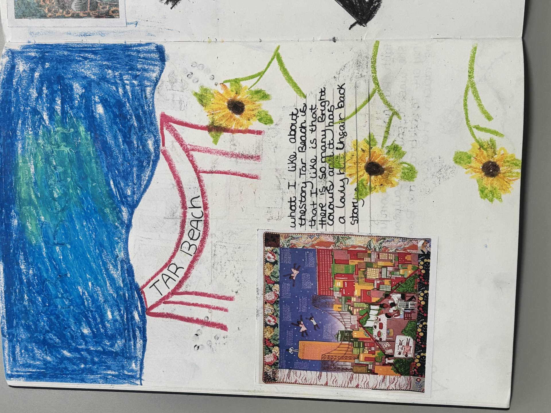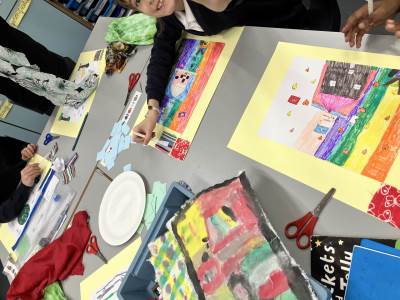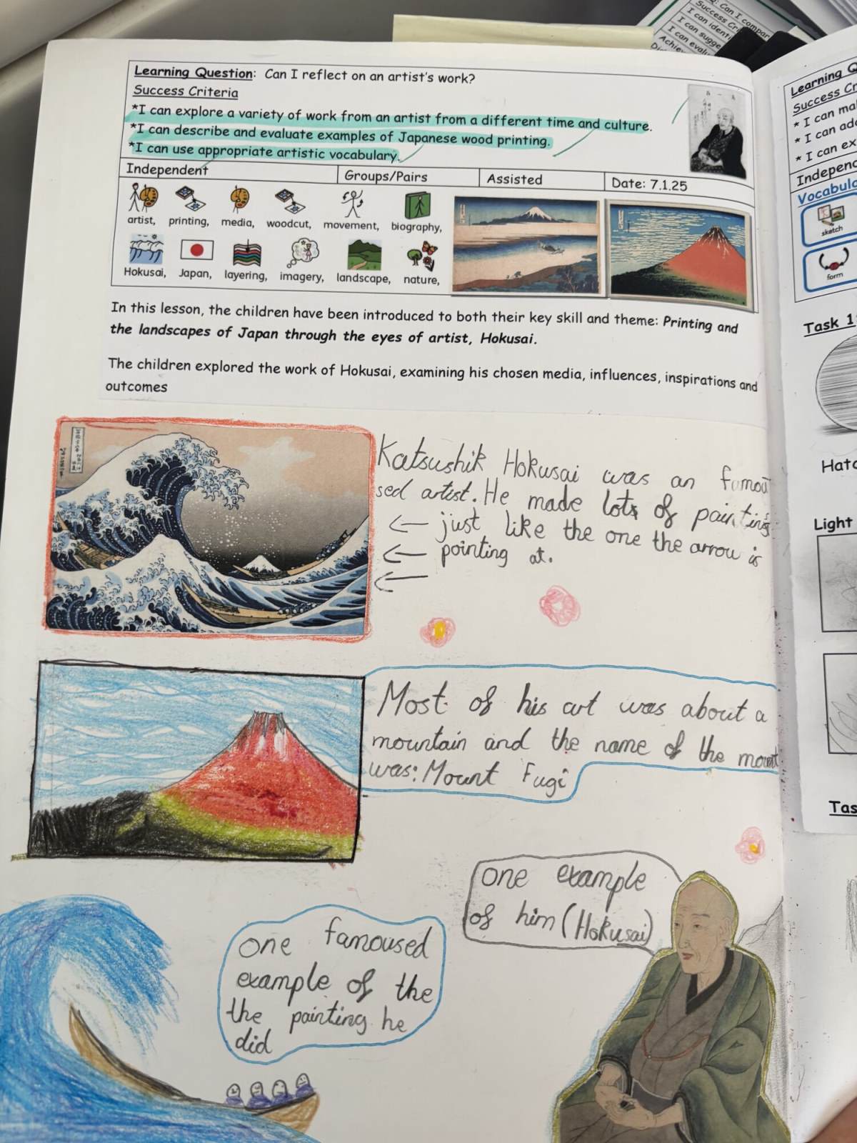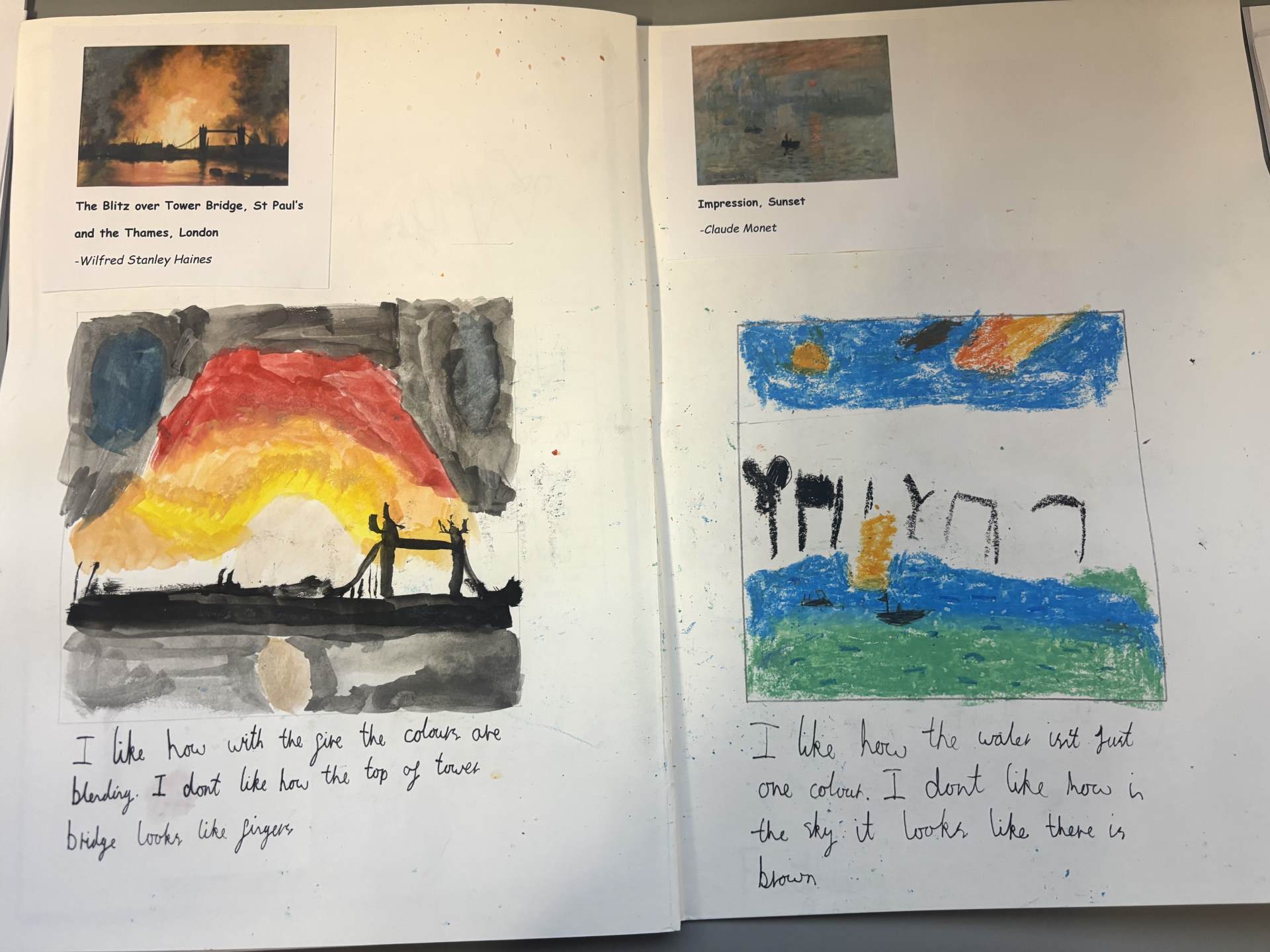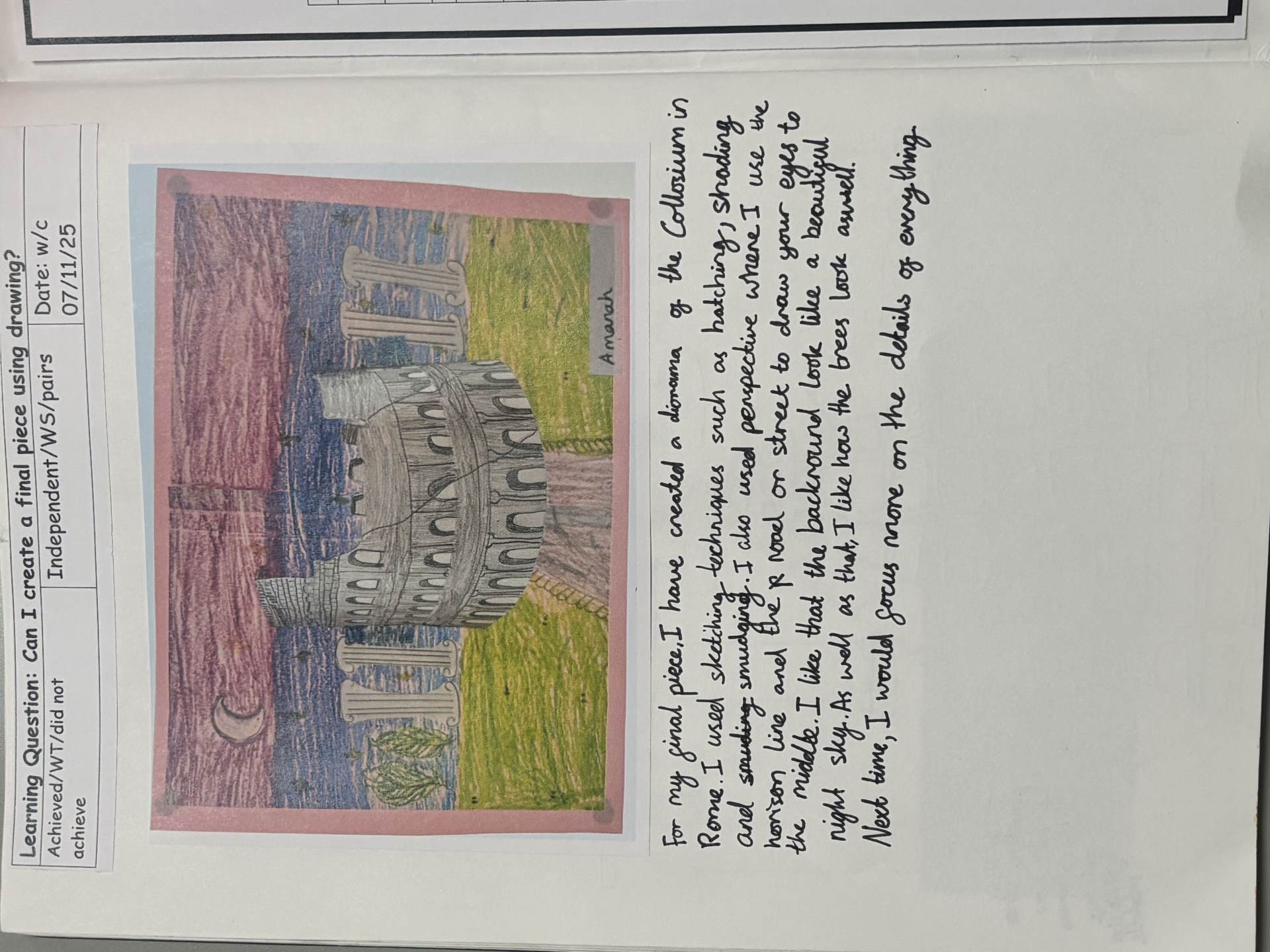 The children regularly reflect on their work, both verbally and through sketchbook annotations, articulating their ideas using a sophisticated art vocabulary. They evaluate their own and others' work thoughtfully, considering artistic choices and cultural influences.