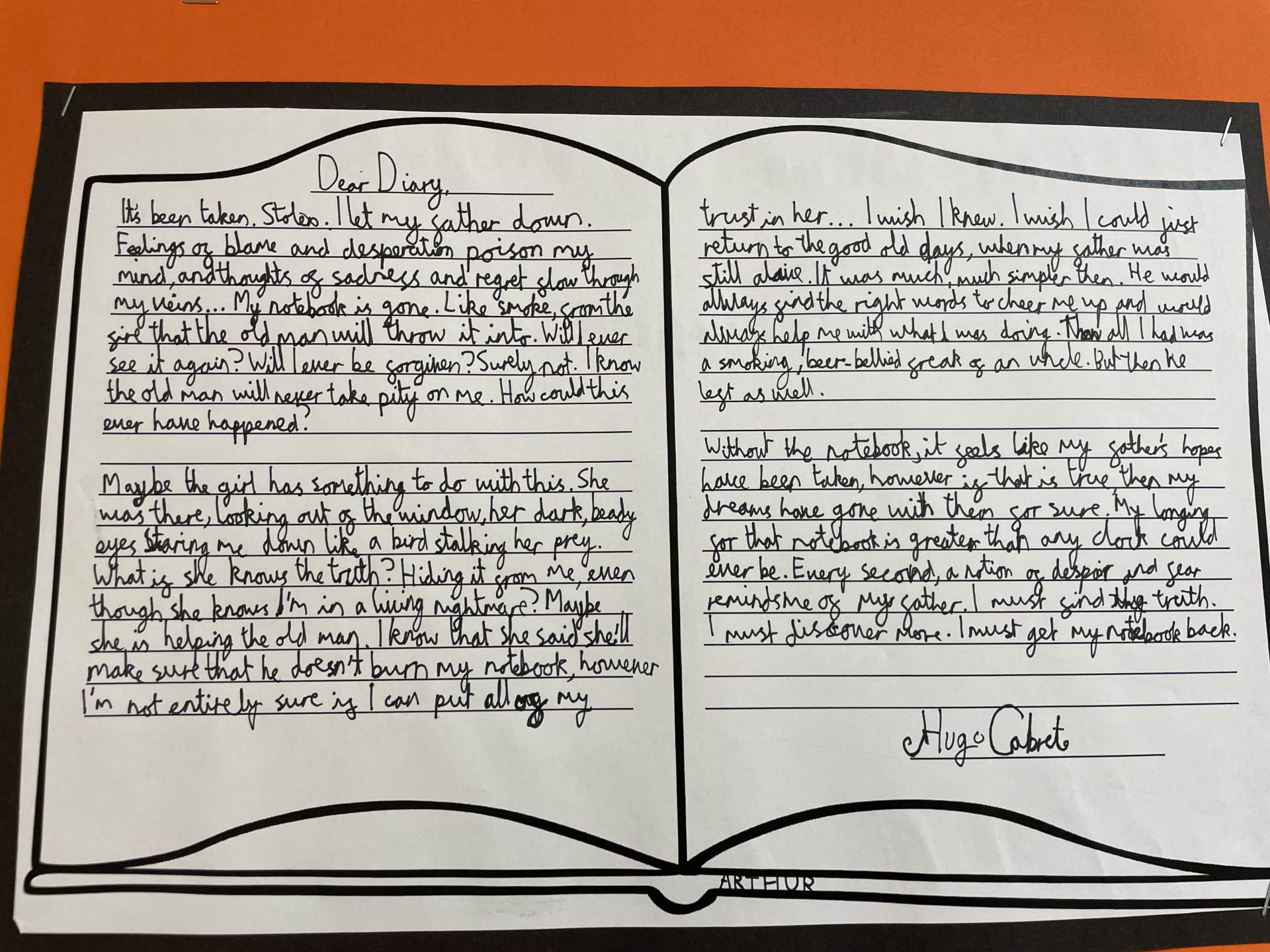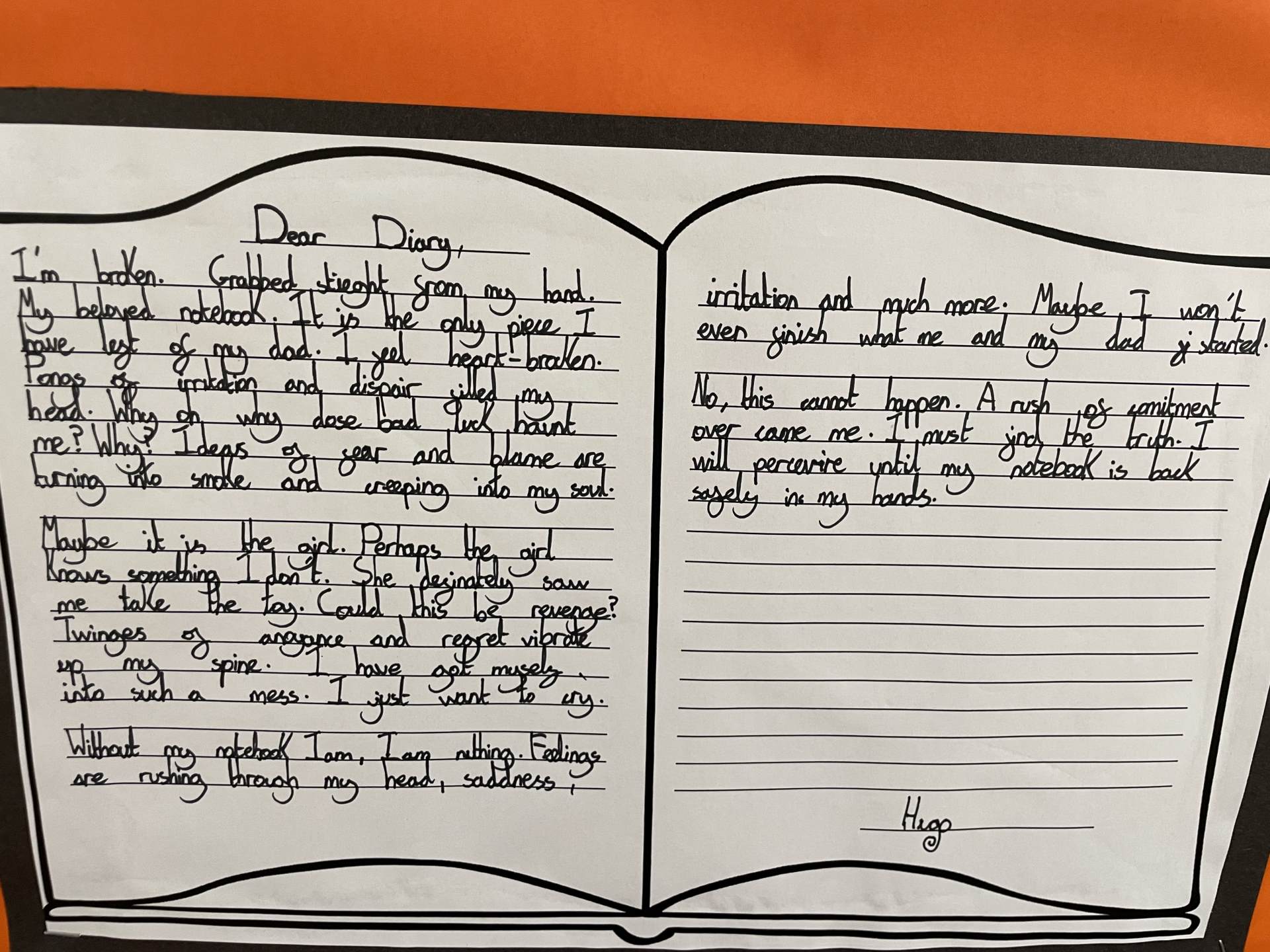 In year 6, children learn to confidently write for a range of purposes and audiences, including a focus on formal and informal writing features. They broaden their vocabulary through shared class texts, exploring how writers develop characters and plots, make decisions about vocabulary and grammar within their texts, and how different layout features are employed for different text types. They incorporate these ideas into their own writing. Children secure the correct use of the full range of punctuation, including the use of brackets and dashes for parenthesis, and colons and semi-colons.