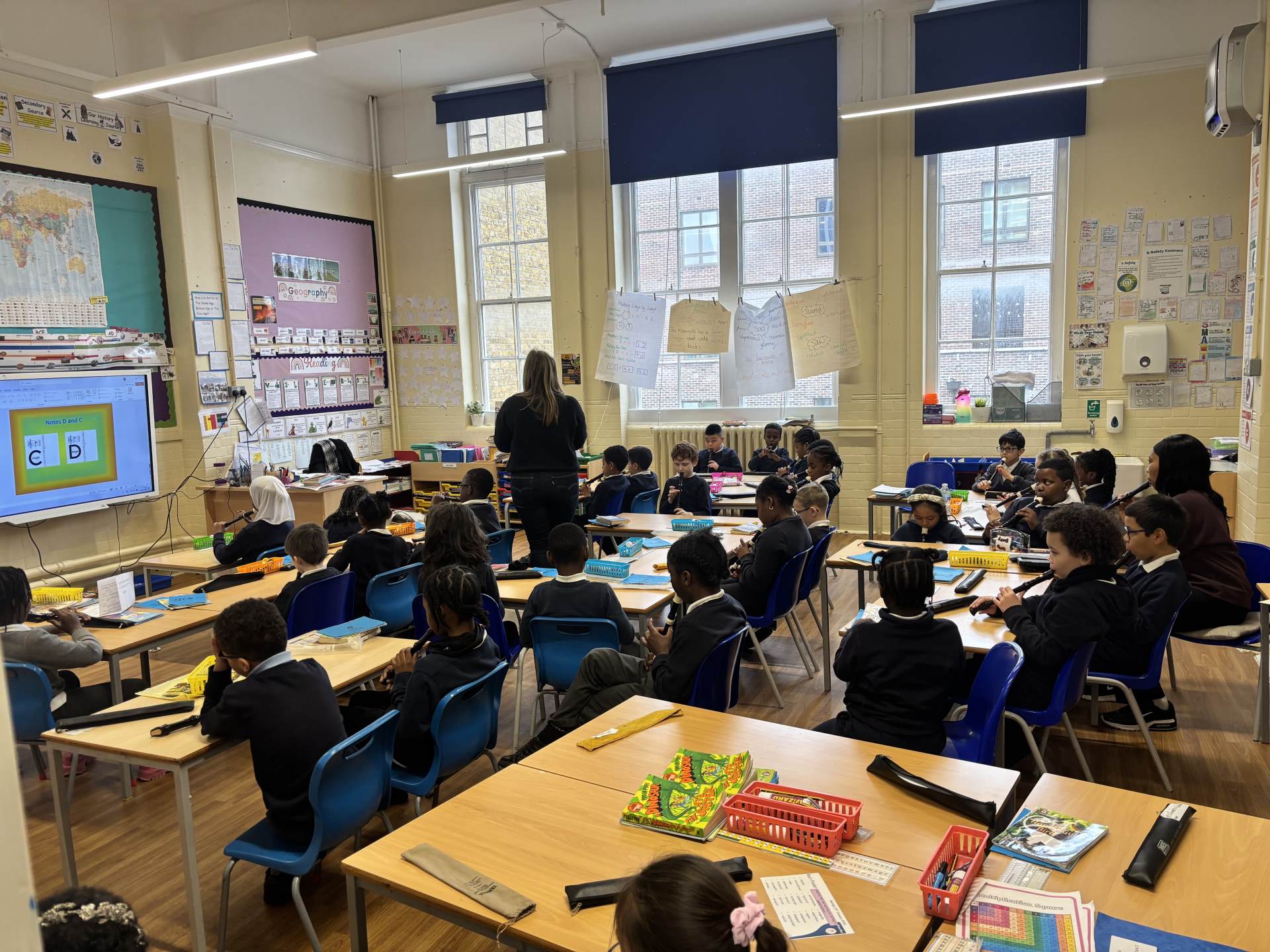 Across the year, the children learn to play a growing repertoire of pieces using backing tracks, listening skills and simple music notation, including symbols for articulation. They listen to a wide range of music featuring woodwind instruments from different genres and cultures, helping them deepen their musical understanding. By the end of Year 5, the children can read and play simple scores, perform confidently to an audience, and show increased independence, accuracy and expression in their music-making.