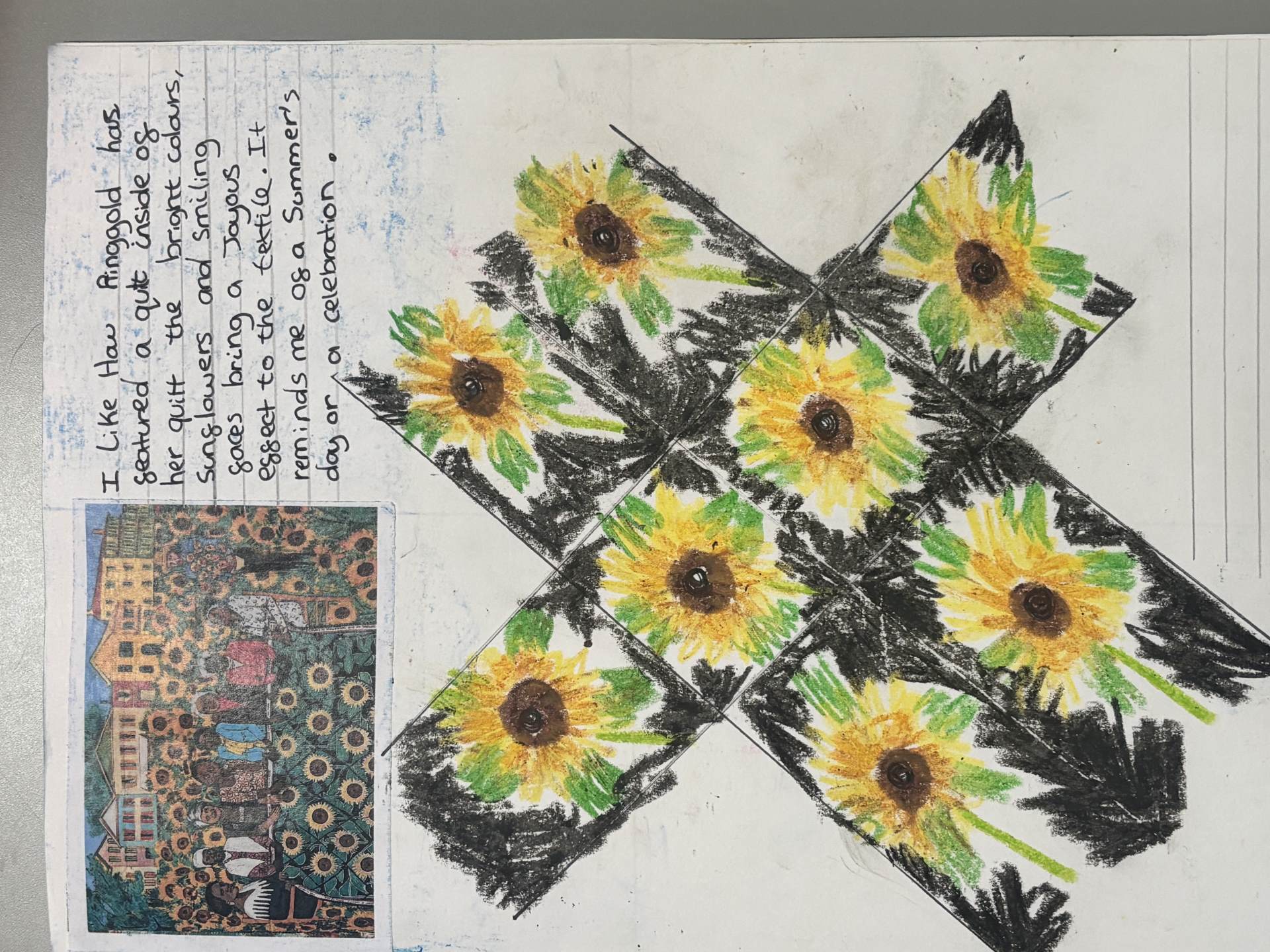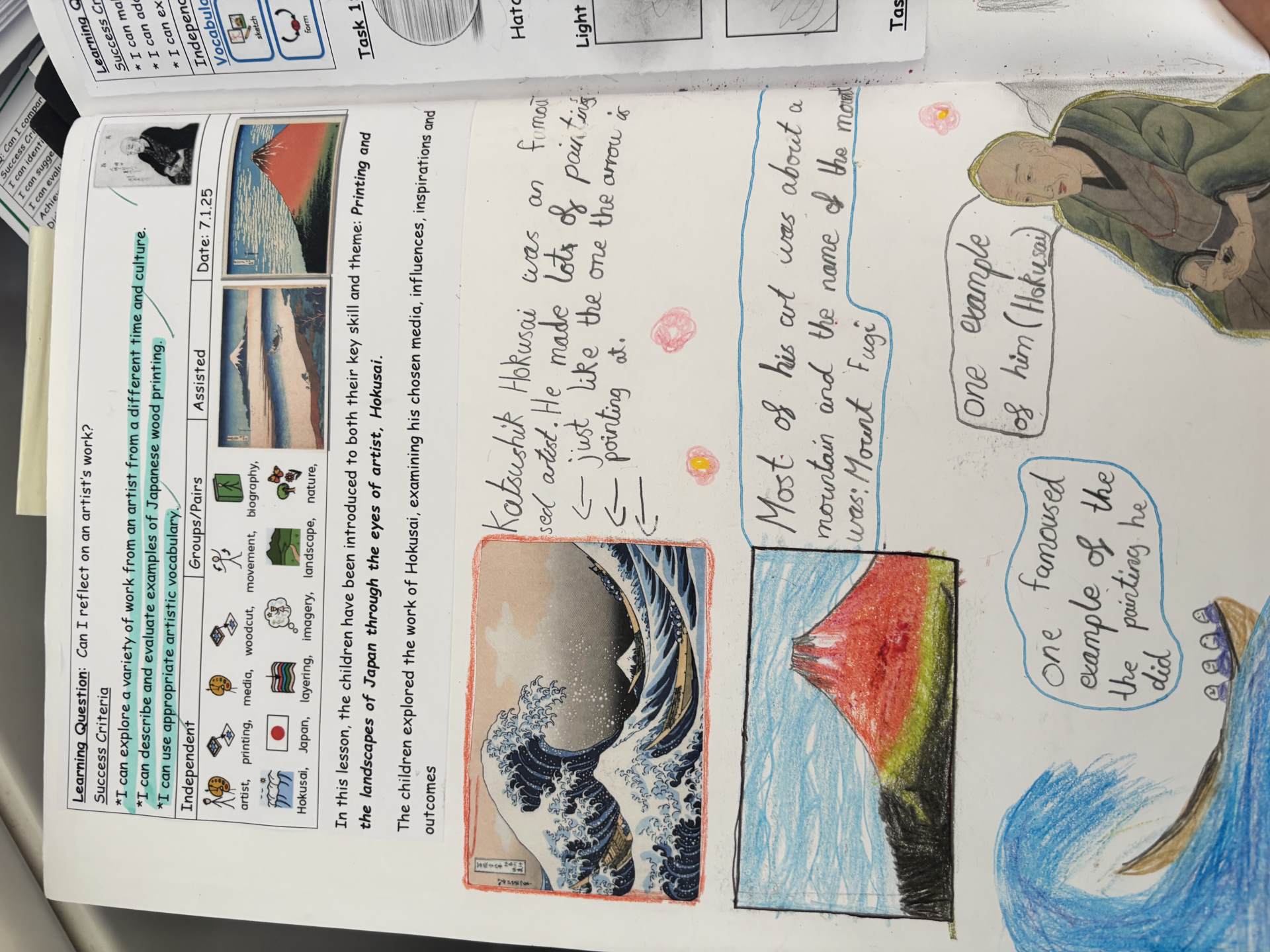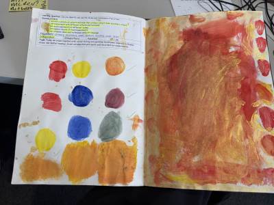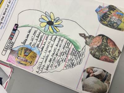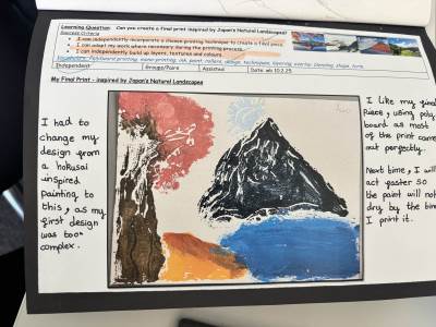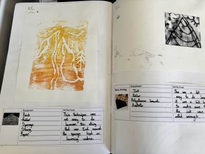 The children regularly reflect on their work, both verbally and through sketchbook annotations, articulating their ideas using a sophisticated art vocabulary. They evaluate their own and others' work thoughtfully, considering artistic choices and cultural influences.