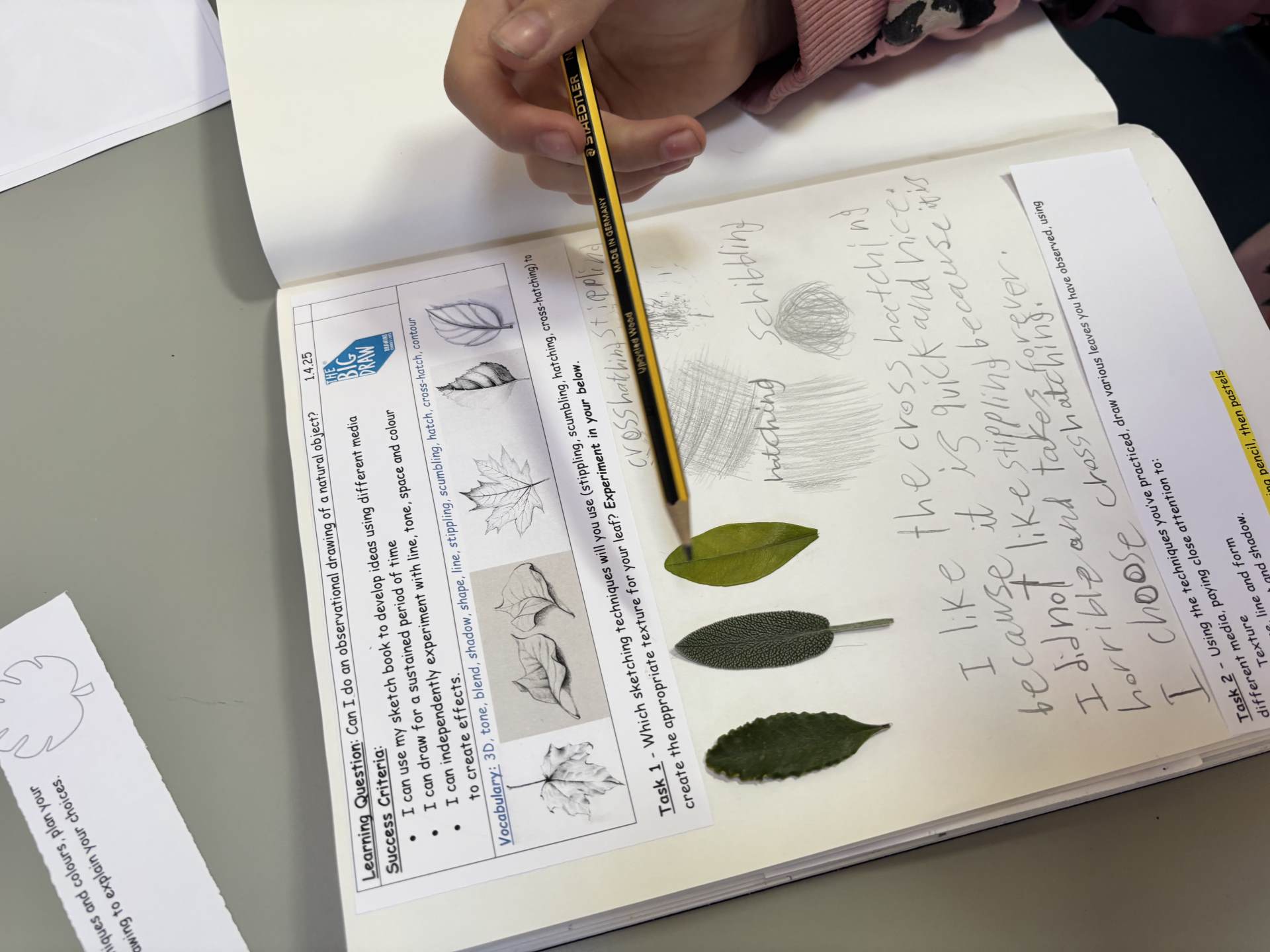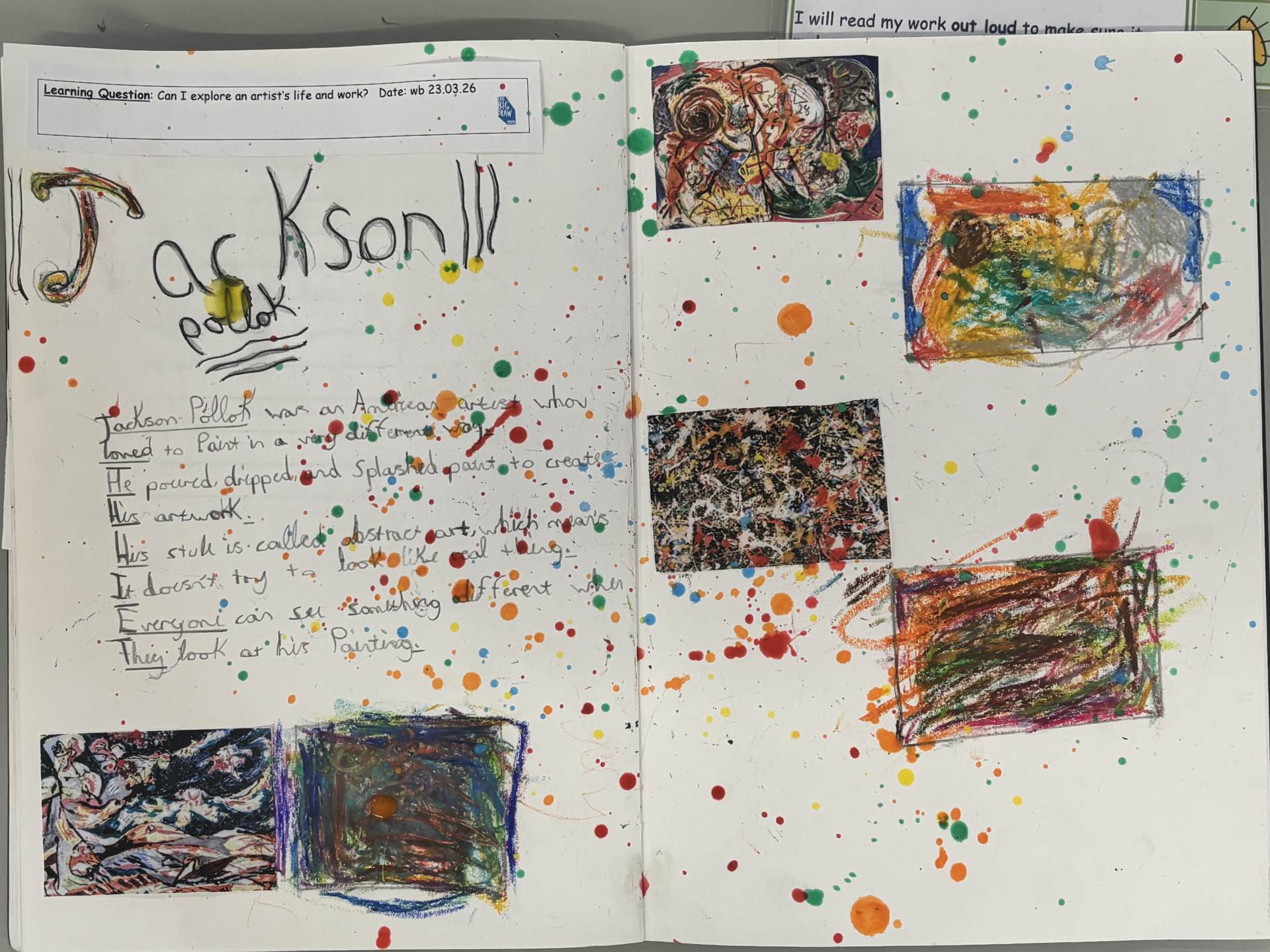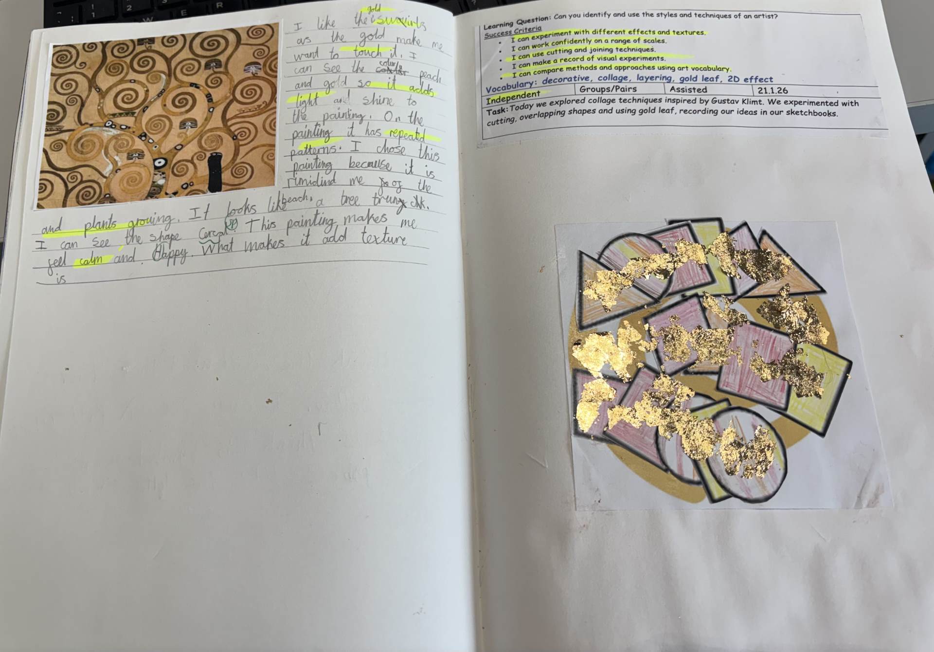 The children regularly reflect on their work, both verbally and through sketchbook annotations, articulating their ideas using a sophisticated art vocabulary. They evaluate their own and others' work thoughtfully, considering artistic choices and cultural influences.