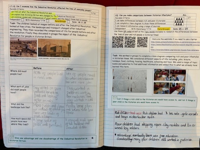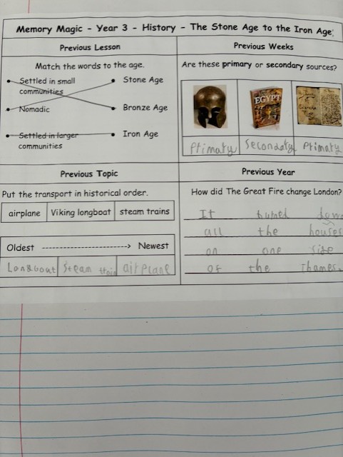 Opportunities for frequent oral and written recall of learned knowledge happen throughout each unit. Practical and creative learning leads to a written outcome, which assesses children’s understanding, progress of knowledge and concepts covered.