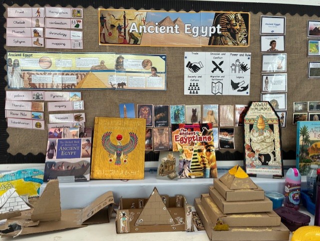 One of Year 3's History topics is Ancient Egypt. The children learn about hieroglyphics and the role of Scribes, the importance of Cleopatra as female Pharaoh, societal structure in ancient Egypt and the amazing feat of building the pyramids. They enjoy a range of creative and explorative activities, which they then apply to their end of unit 'topic write'. They also have a fantastic time when visiting the British Museum to see the incredible Ancient Egyptian artefacts. Have a look at some of our Year 3 children's depictions of Ancient Egyptian life.