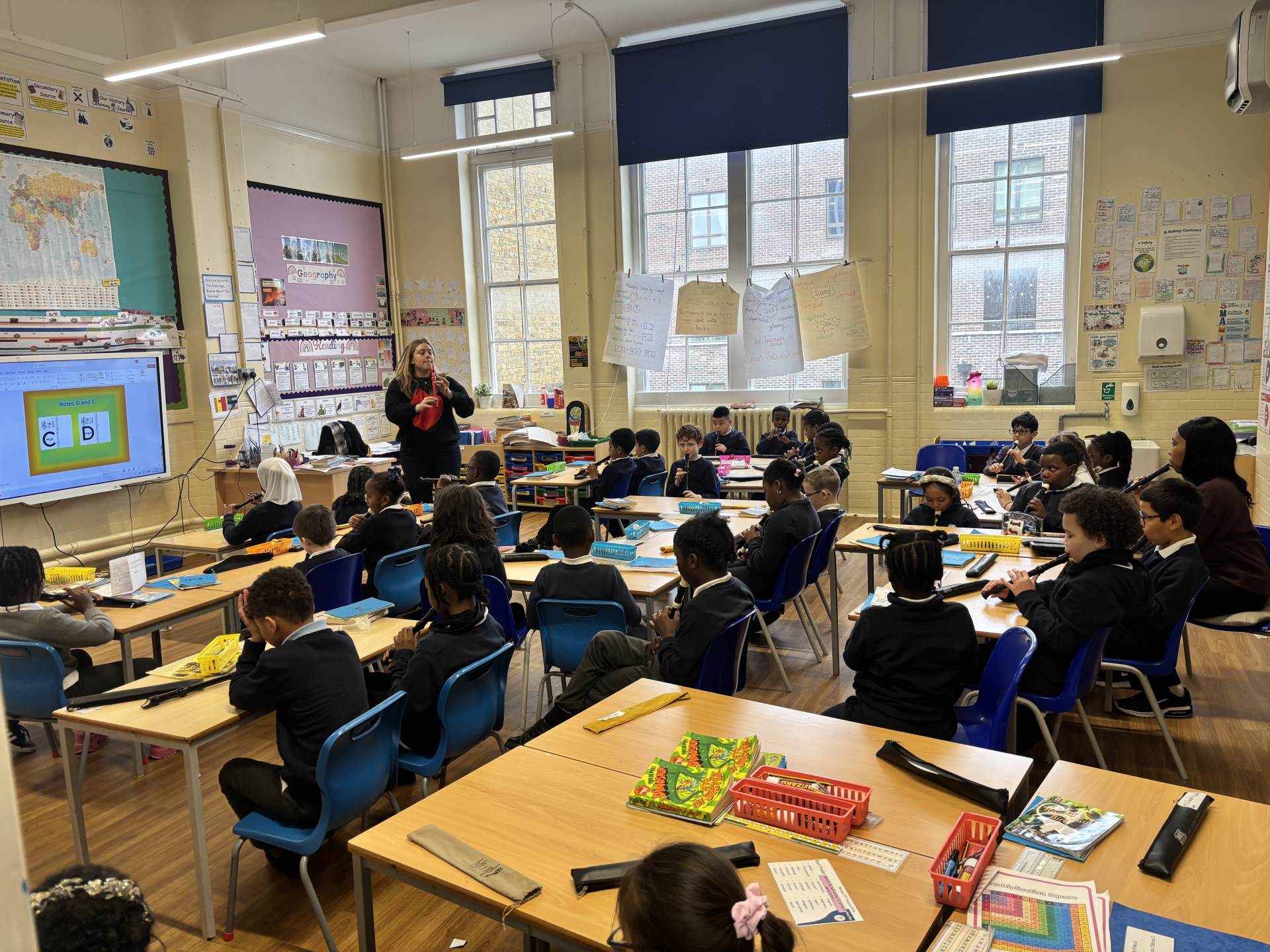 Across the year, the children learn to play a growing repertoire of pieces using backing tracks, listening skills and simple music notation, including symbols for articulation. They listen to a wide range of music featuring woodwind instruments from different genres and cultures, helping them deepen their musical understanding. By the end of Year 5, the children can read and play simple scores, perform confidently to an audience, and show increased independence, accuracy and expression in their music-making.